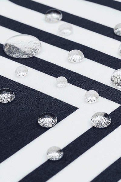 生地の表面に微細な凸凹構造を形成し、疑似的な蓮の葉構造を再現することで、高い撥水性を実現しました。 蓮の葉には微細な突起があり、その間にある空気層が水滴を浮かび上がらせます。この仕組みを応用することで、付着した水は丸い球体状となり、接触角150°を超える超撥水性能を発揮します。