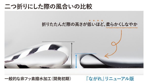 一般的な非フッ素撥水加工では、生地は硬くなってしまうことが課題とされています。