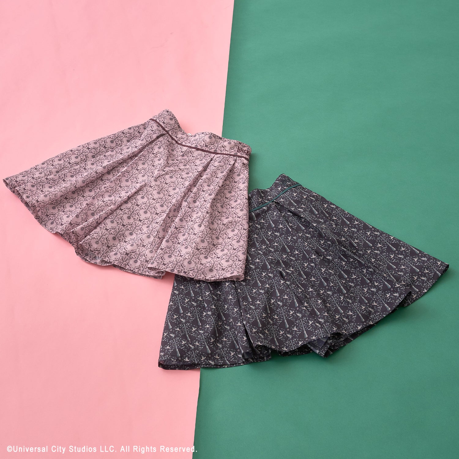 エルファバとグリンダを想起させる杖と箒をモチーフにした柄が印象的なフレアキュロット。ウエストのパイピングや刺しゅうまで細部にこだわり、物語の世界観をさりげなく楽しめる一枚です。