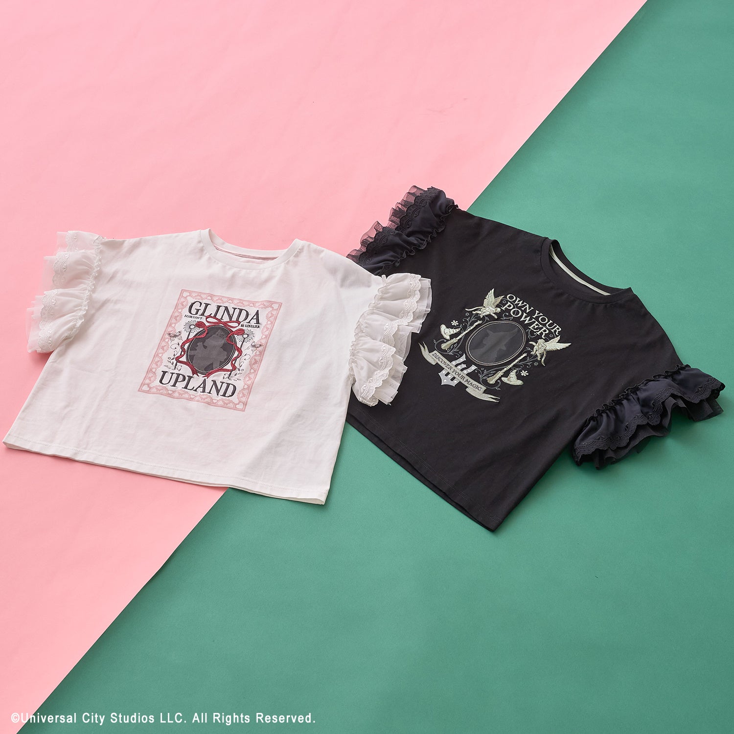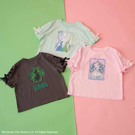 袖のレースアップデザインが目を引く、シンプルながら主役級の存在感を放つ一枚。カラーごとに異なるグラフィックでグリンダやエルファバ、ふたりの象徴的なシーンを表現し、物語の世界観をさりげなく楽しめるデザインに仕上げました。