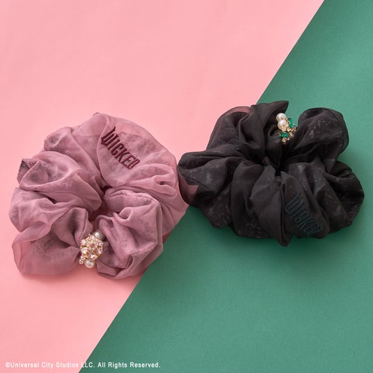 エルファバとグリンダを想起させる杖と箒のモチーフ柄に、オーガンジー生地を重ねた華やかなシュシュ。ふたりのカラーをイメージしたビジューやパール、ビーズがきらめく、存在感抜群のアイテムです。