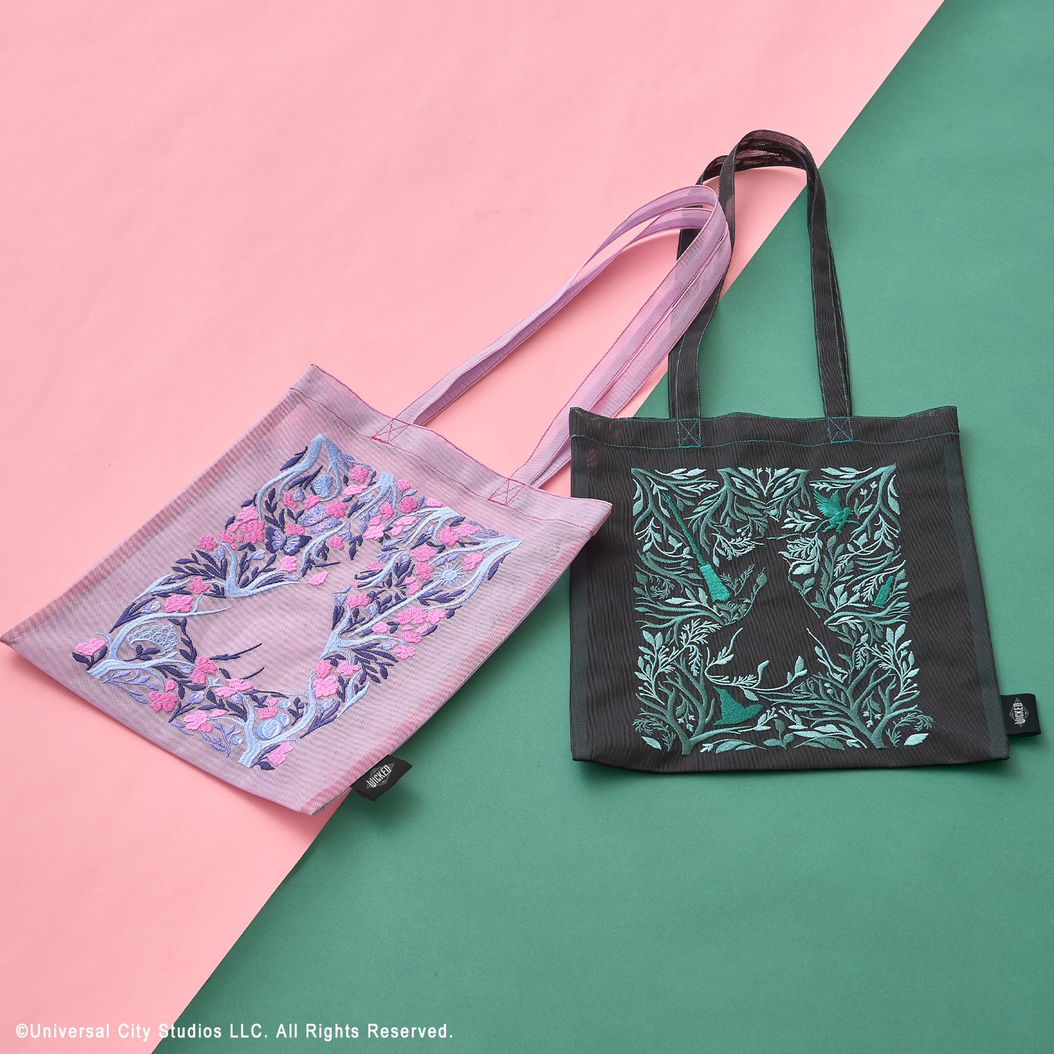 エルファバとグリンダの物語を繊細な刺しゅうで表現したメッシュトート。草花の間にふたりのシルエットが浮かび上がる幻想的なデザインに、ステッチやパイピングのカラーがアクセントを添えます。A4サイズ対応や仕切りポケット付きで、実用性も兼ね備えたアイテムです。