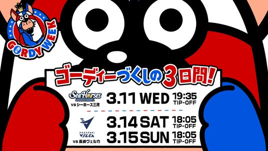 また、3月11日(水)三河戦、3月14日(土)、15日(日)長崎戦の計3日間のホームゲームでは、ゴーディーの魅力が詰まった「GORDY WEEK」を開催します。