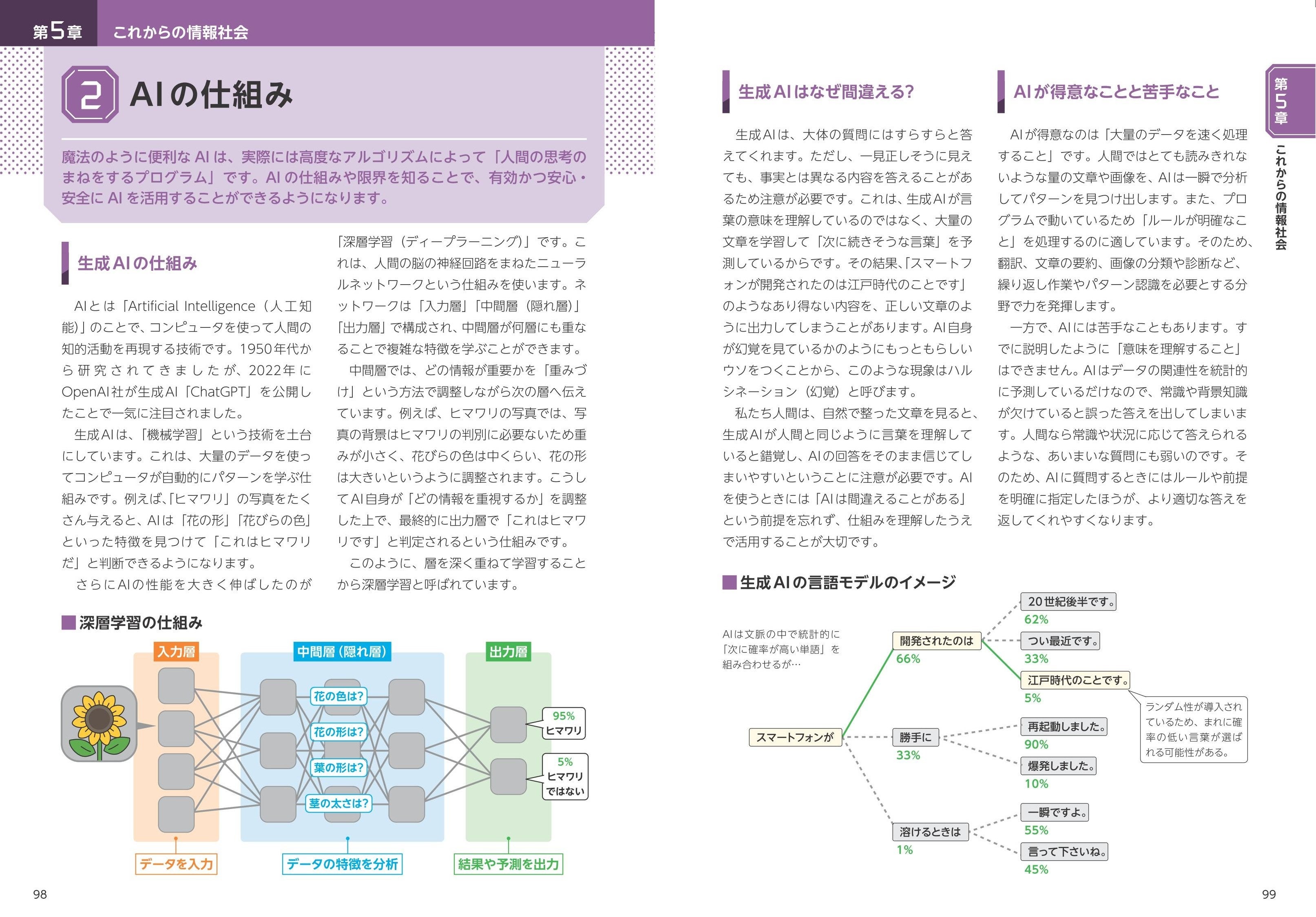 本書は、情報やインターネットの定義、AIの仕組みなどの土台となるような部分から、フェイクニュースの見分け方やプログラミングの使い方など、実践的な内容を網羅!図表、イラスト、写真を使い、全ページオールカラーで視覚的ににわかりやすく「情報リテラシー」を学ぶことができます!