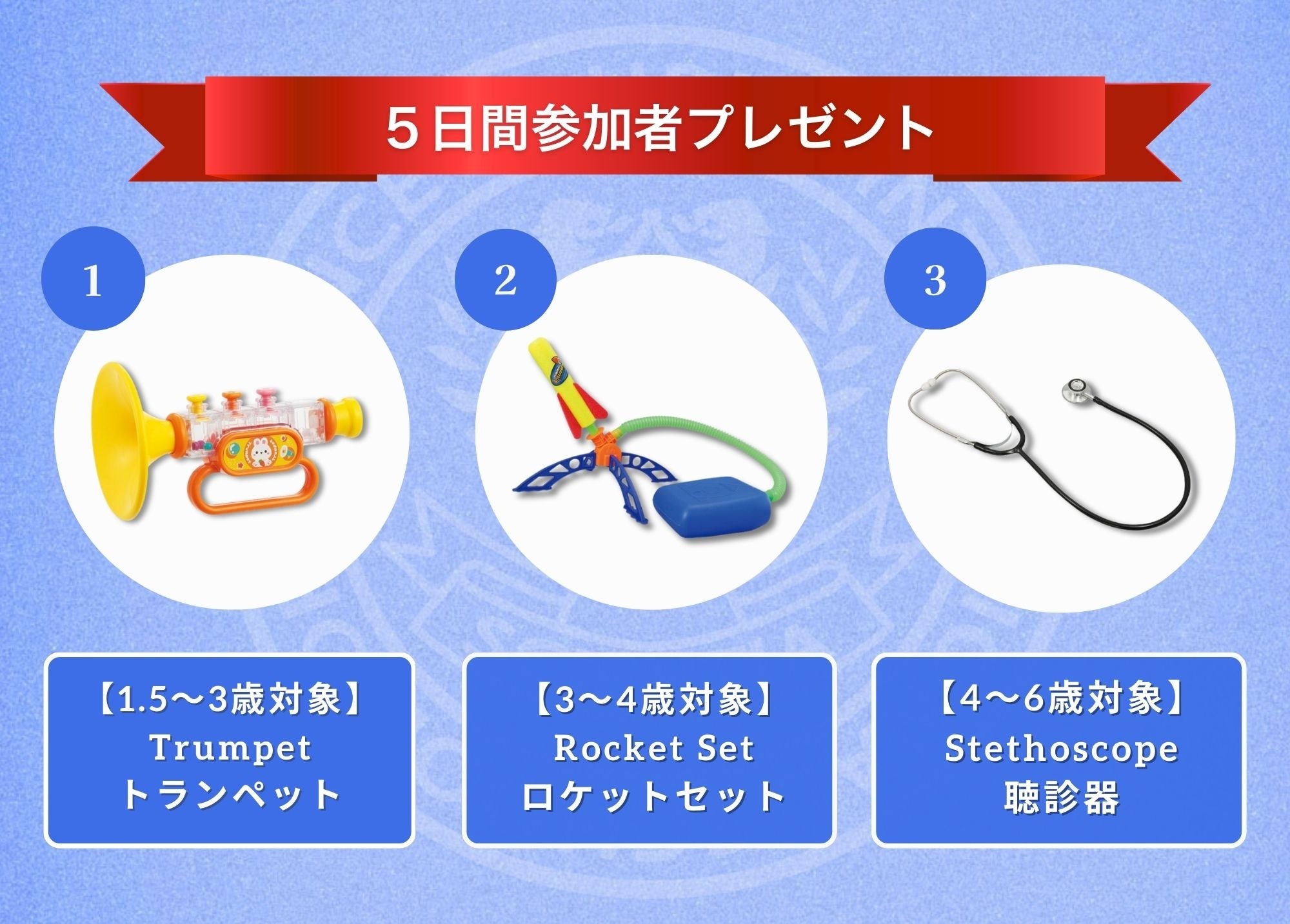- 5日間全て参加したお子様対象の特典年齢に応じて、職業に関連するおもちゃを1つプレゼントいたします。