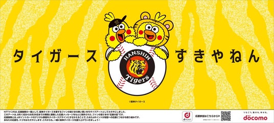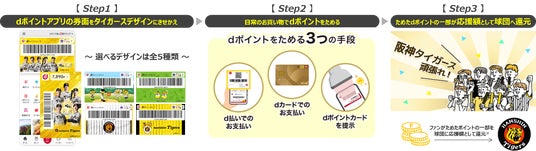 なお、本取組みは、「dポイントクラブ」アプリおよび「d払い」アプリからモバイルdポイントカードの券面を阪神タイガースのデザインにきせかえて、「dポイントカード」の提示、「d払い」でのお支払い、「dカード」でのお支払いのうちいずれかの方法でdポイントを貯めると、対象期間中にたまったdポイントの5%の金額を応援金とし、ドコモが阪神タイガースの応援広告出稿等を実施するものです。