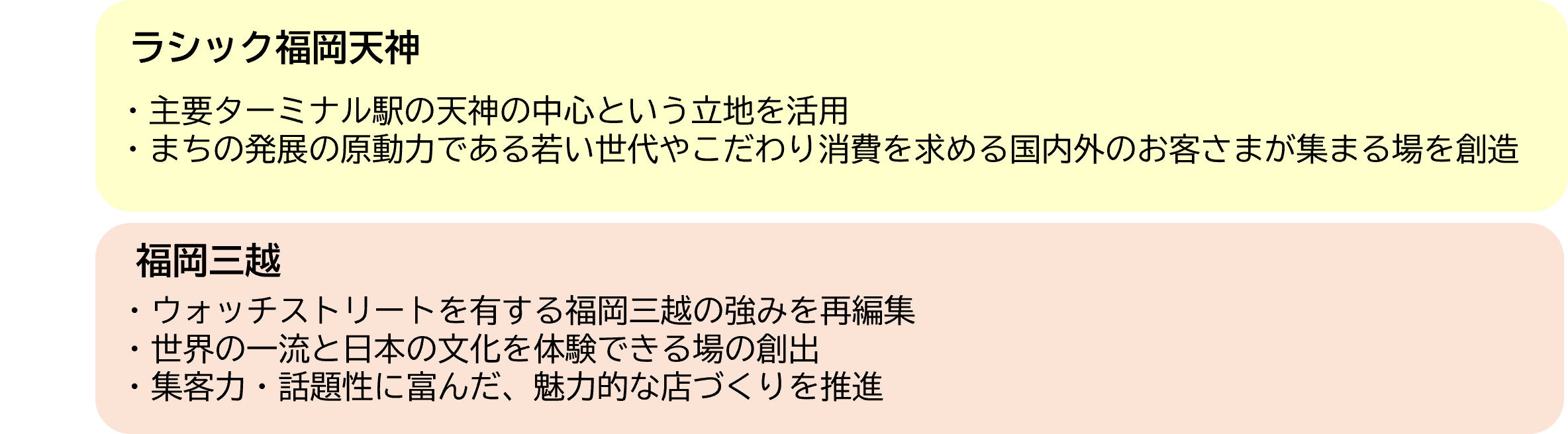 今まで岩田屋三越をご利用いただいているお客さまだけでなく、さらに天神というまちの発展の原動力である次世代のお客さまにもアプローチするため、上層階に専門店ゾーンラシックを拡大し「好きや興味関心の熱量と共感」から生まれるこだわり消費を狙ったコンテンツを提供してまいります。また、下層階の福岡三越ではウォッチストリートをはじめとする専門性の高いコンテンツを引き続き提供し、将来的には館全体の回遊性を高めたハイブリッド型のモデルを目指します。