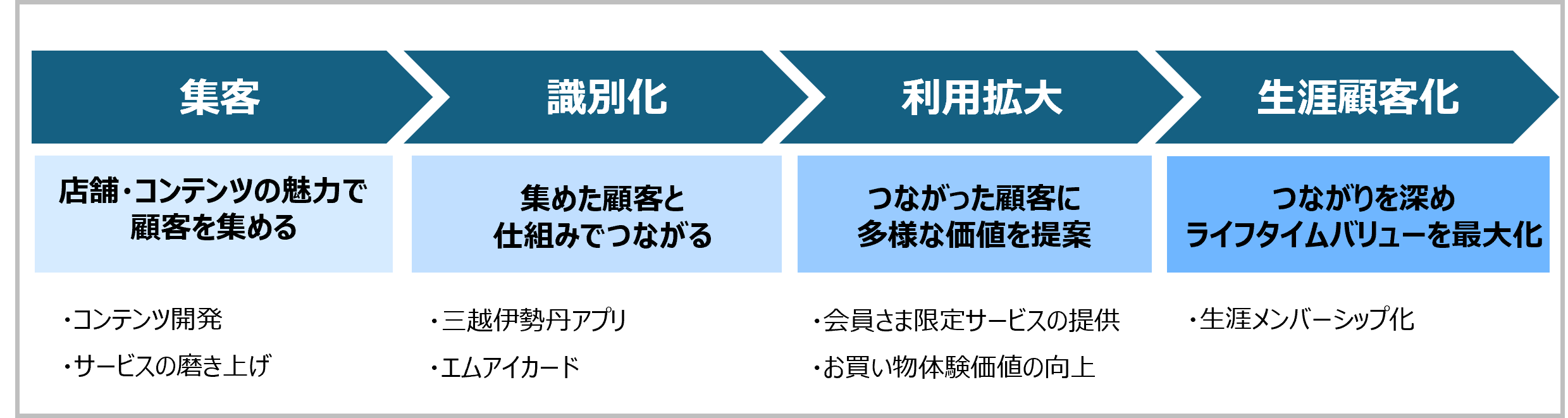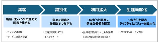 三越伊勢丹グループでは、「お客さまの暮らしを豊かにする、‘’特別な‘’百貨店を中核とした小売グループ」の実現に向けて、ビジネスモデルを“館業”から“個客業”への転換を進めています。世界中から集客し、店舗やサービスをご利用いただき、つながったお客さまのことを深く理解し、多様な顧客価値を提案することでお客さまとのつながりを深め、ウォレットシェアとライフタイムバリュー(LTV)の最大化を目指すビジネスモデルを「個客業」とし、4つのプロセスを通して実現に向け取り組んでいます。