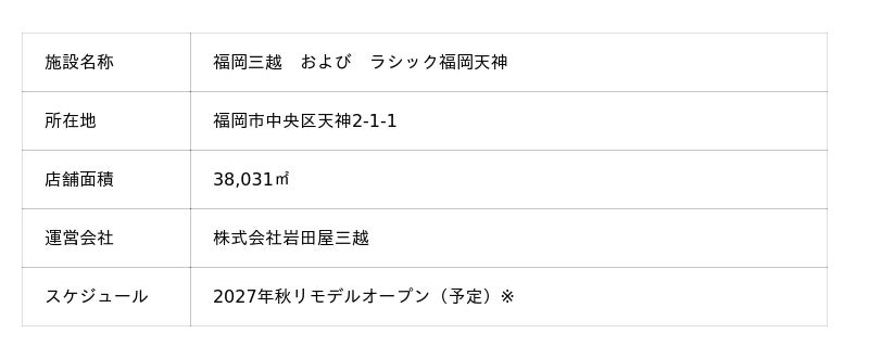株式会社岩田屋三越(福岡市中央区/代表取締役社長執行役員 左中樹太郎)は、三越伊勢丹グループの目指す姿である「お客さまの暮らしを豊かにする、‘’特別な‘’百貨店を中核とした小売グループ」の実現に向けて、福岡三越ならびにラシック福岡天神のリモデルを2026年春より順次実施し、 2027年秋にリモデルオープンします。