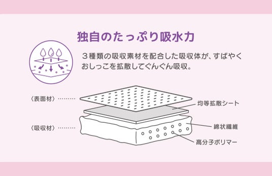 薄くすっきりとした設計でありながら、しっかりと吸収する構造を採用。赤ちゃんの活発な動きを妨げにくく、日中はもちろん就寝時まで安心して使用できます。さらに、肌に触れる部分にはやさしい素材を使用し、ベールのようにふんわりと包み込む快適な使用感を実現しました。