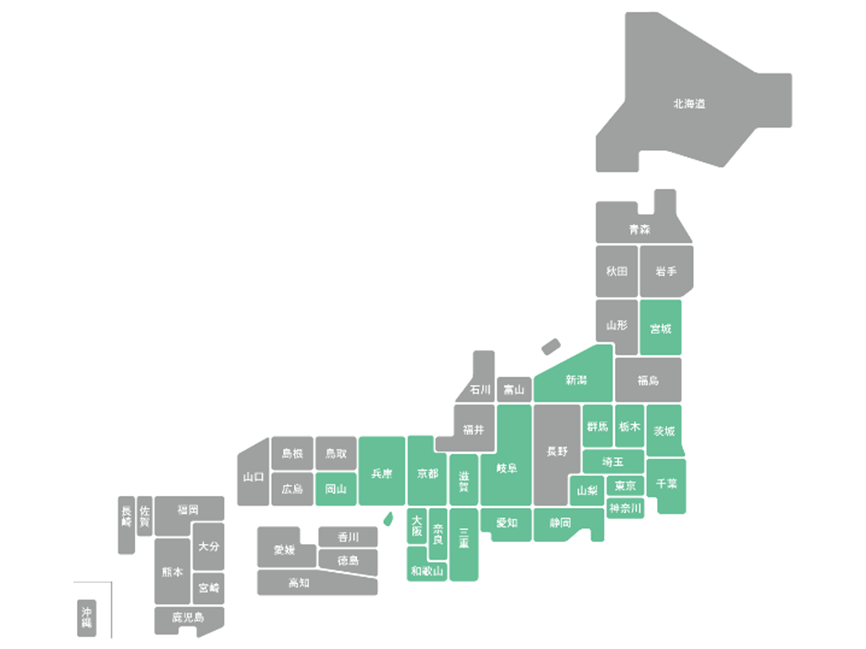 リリーフは広いエリアでサービスを展開しており、今回の「リリーフ三重桑名店」オープンにより、東海エリアのネットワークがさらに強固になりました。遠方のご実家の整理や、複数拠点にまたがる案件も、リリーフのネットワークでスムーズに対応いたします。現在のサービス展開エリアにつきましては、下図の緑色で示された地域となります。