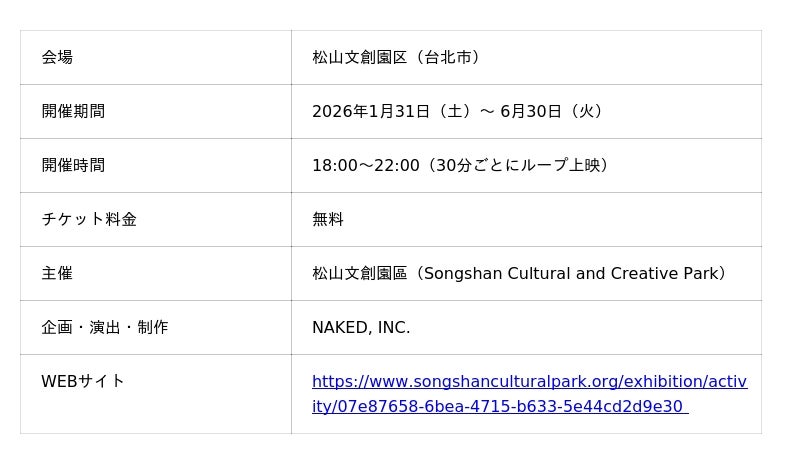 株式会社ネイキッド(英語表記:NAKED, INC. 、所在地:東京都渋谷区、代表:村松亮太郎)は、2026年1月31日(土)~6月30日(火) までの期間、台北の文化拠点・松山文創園區で開催される松菸夜光花園(The Luminous Garden)にて『DANDELION PROJECT』を出展いたします。