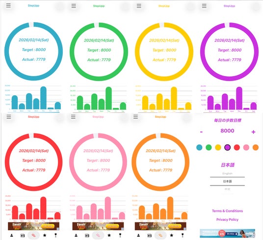 StepUppは、「簡単な操作で楽しく継続出来る」をコンセプトに、以下のような"毎日目標を決めて歩く"という行動変容のための機能を備えております。日本含めApp Store/Google Play経由で全世界からダウンロード出来ます。