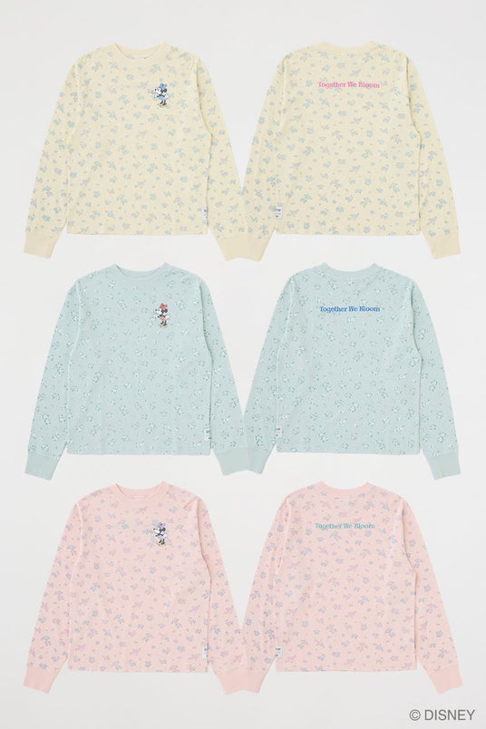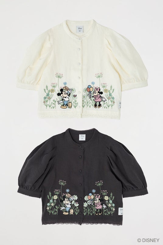 繊細なピコレースを贅沢にあしらい、ナチュラルな風合いに仕上げたブラウスには、ボタニカルなモチーフと共に、MICKEY&MINNIEを緻密な刺繍で表現した、温もりあるデザイン。可憐な小花柄の中に、軽やかに花を吹くMINNIEを左胸に、バックにはTogether We Ribbonのワードを刺繍で表現したワッフル素材のロンT。