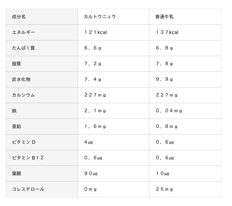 『カルトウニュウ』は、カルシウムやビタミンDにとどまらず、牛乳に近い栄養バランスを 目指した乳代替飲料です。