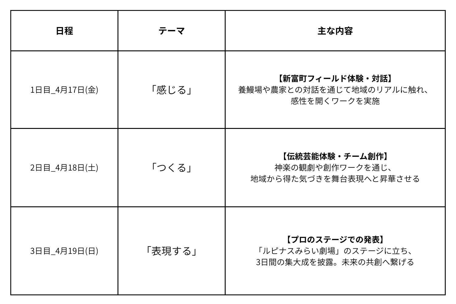 参加者は全3日間の滞在中、新富町内で様々な事業者との交流を経て、五感をフル活用して町と出会います。最終日には、こゆ財団が指定管理する新富町文化会館「ルピナスみらい劇場」で、表現へと昇華させます。- プログラム実施期間: 2026年4月17日(金)~19日(日)