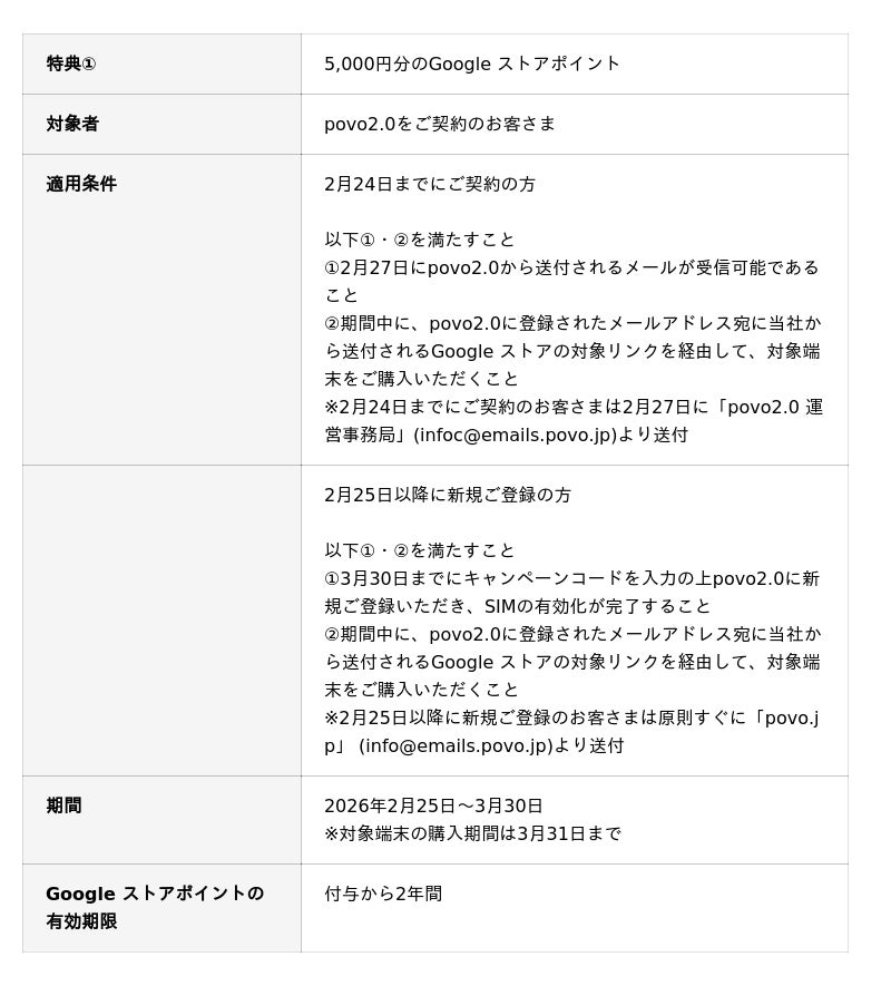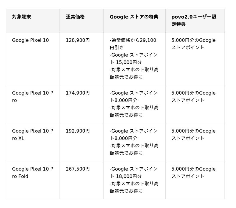 KDDI、沖縄セルラーは2026年2月25日から、povo2.0ユーザーを対象に、Google ストアにおいて開催中の「新生活キャンペーン」に合わせてGoogle Pixel 10 シリーズの対象端末を購入いただくと、次回以降にGoogle ストアで使えるGoogle ストアポイントをプレゼントする「Google ストアコラボキャンペーン」を実施します。