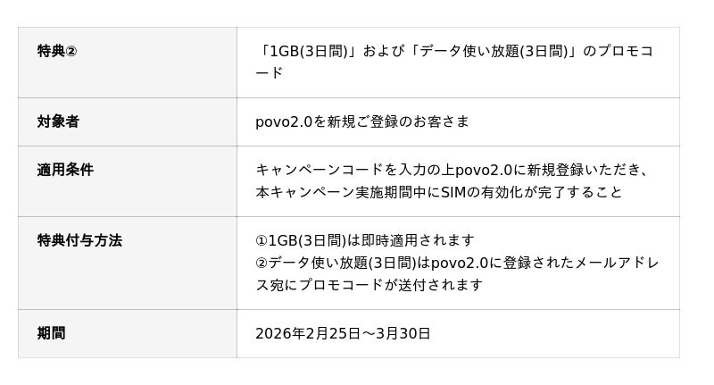 また、現在povo2.0をご利用中でない方もキャンペーン期間中、キャンペーンコードをご入力の上、povo2.0に新規ご登録いただくと、同様に「Google ストアコラボキャンペーン」の対象となり、さらに「1GB(3日間)」および「データ使い放題(3日間)」(注)のプロモコードもプレゼントします。
