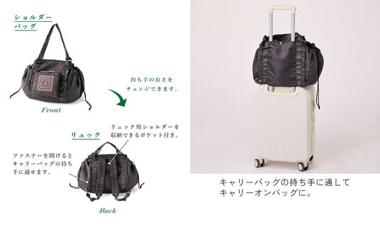 その日のお買い物によって、背負う、肩掛け、手持ちなど、好きなスタイルで楽しめます。持ち手の長さ調節やリュック用ショルダーの収納も可能。背面のファスナーを開けると、キャリーバッグの持ち手にも通せるようになっていて、旅行用としても◎。撥水加工なのもうれしいポイントです。毎日のお買い物はもちろん、ふだん使いから旅行まで幅広く活躍します。
