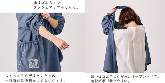 袖はゴム入りでプッシュアップもらくにできます。背中はゴムでつながったオープンタイプなので、着脱簡単でノンストレス。動きやすいのも特徴です。