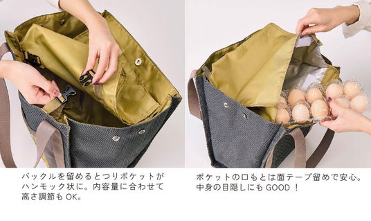 卵や果物などそっと運びたいものを、浮かせてやさしく持って帰れるトートバッグです。内側にあるつりポケットを橋渡しすると、バッグの中にハンモックが出現します。つりポケットの中はアルミ蒸着仕様で、あたたかいもの、冷たいものを分けて運ぶのにも重宝します。デザインは、〈グレー×シトロンイエロー〉〈ベージュ×レーズンパープル〉〈ネイビー×ピーチピンク〉の3種類です。