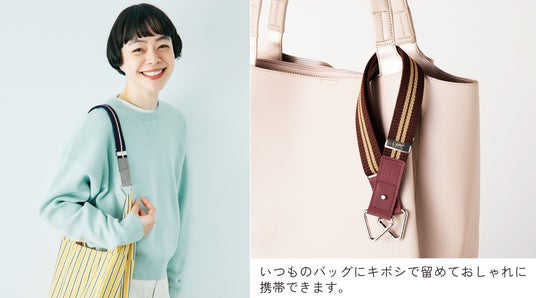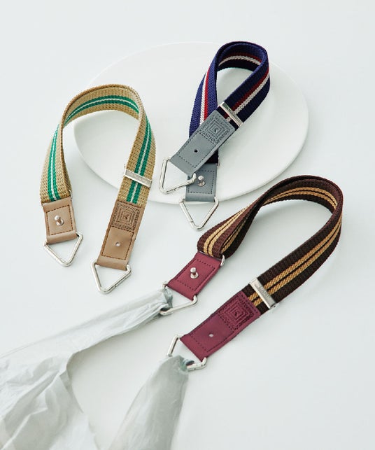 エコバッグやレジ袋に付けることで、腕に食い込むストレスを解決してくれる人気の延長ショルダーに、幅広仕様になった紀ノ国屋コラボバージョンが新登場です。三角カラビナをバッグの持ち手に引っかけるだけで、持ち手が伸びて、荷物が多い日のお買い物をサポートしてくれます。デザインはどんなスタイルにもなじみやすい上品な雰囲気が魅力の〈サンドベージュ〉〈ロイヤルネイビー〉〈クラシカルブラウン〉の3種類です。