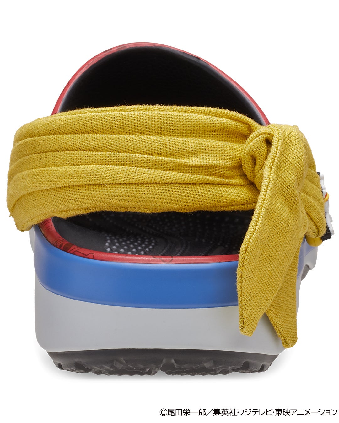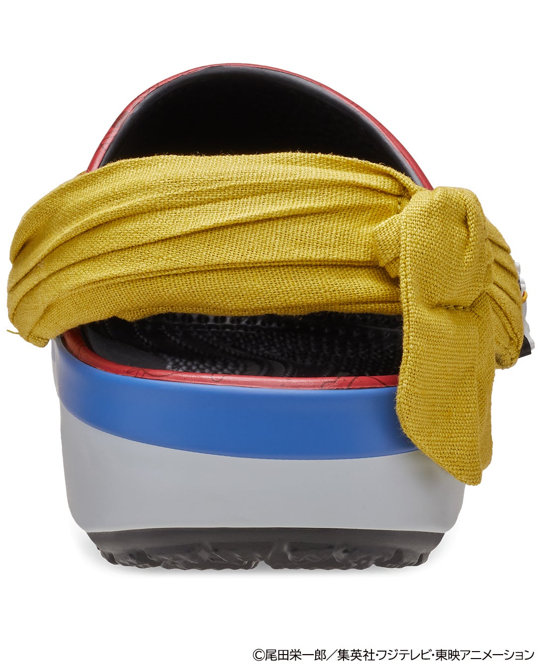 「ワンピース サウザンド・サニー号 クラシック クロッグ」は、麦わらの一味の船、サウザンド・サニー号をモチーフにしたデザインで、両サイドに船体をイメージしたプリントを施しています。シューズの後部には、立体的な舵のデザインを配置。さらに、折りたためる可動式の3Dセイルジビッツ(TM) チャームがついており、冒険心をくすぐる限定モデルとなっています。