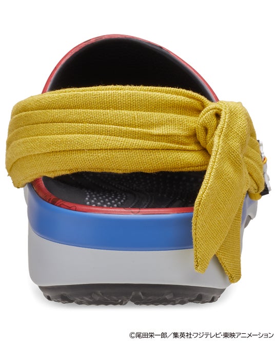 存在感抜群な「チョッパー クラシック クロッグ」は、トニートニー・チョッパーの顔をアッパーの全面にあしらったアイテムです。イエローとホワイトのストライプ柄がバックストラップを彩り、リベット部分にはバックパックをイメージした小さなブルーのポーチが付いています。実際にモノを収納でき、子どもから大人まで履いても楽しい、遊び心あふれるデザインです。