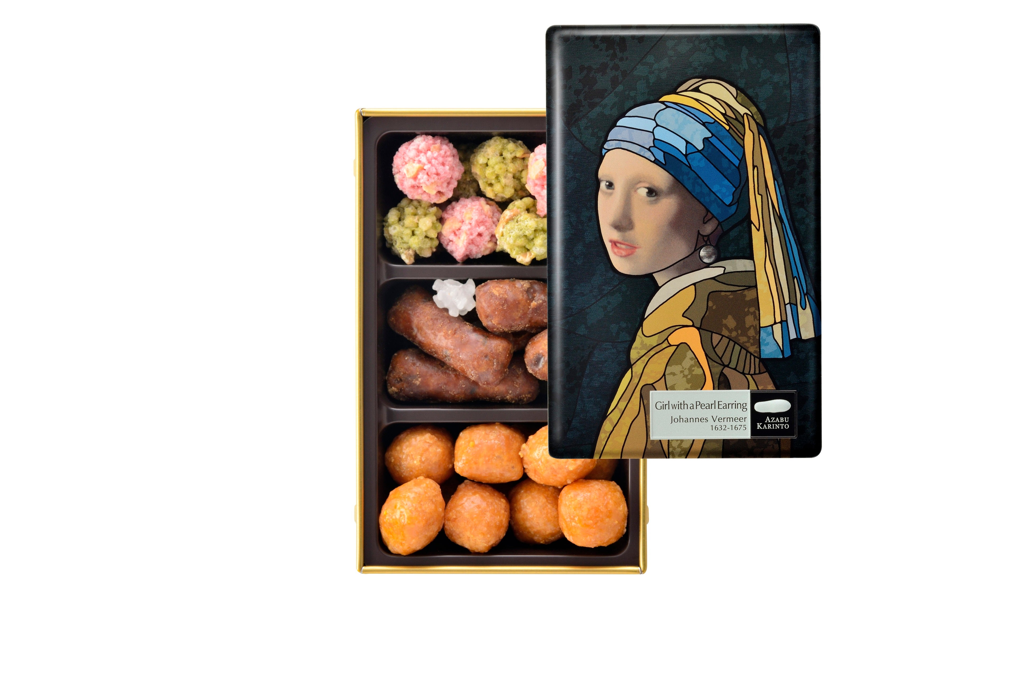 「真珠の耳飾りの少女」(ヨハネス・フェルメール)内容:玉おこし(苺・抹茶)/麻布かりんと(黒糖)・金平糖(白)/柚子丸かりんと