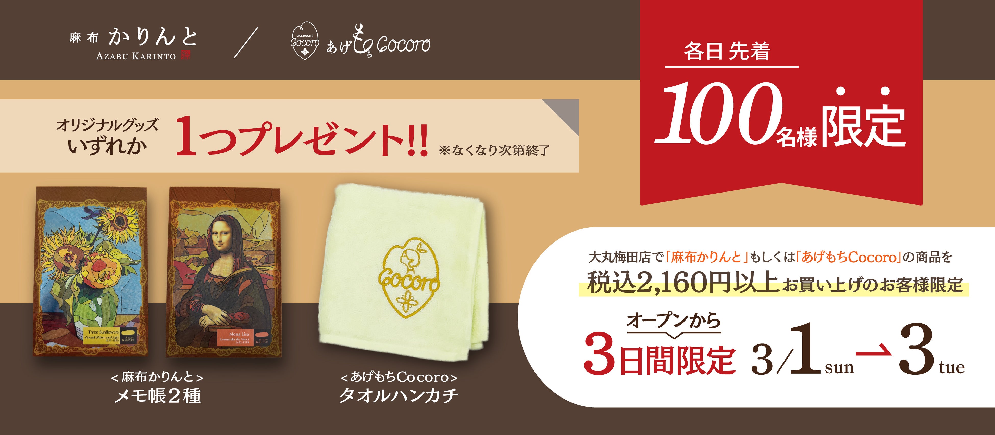 「麻布かりんと」のオリジナルメモ帳2種、もしくは「あげもちCocoro」のロゴマーク入りオリジナルタオルハンカチの中からお好きなものをいずれか1つプレゼントいたします。プレゼント条件: