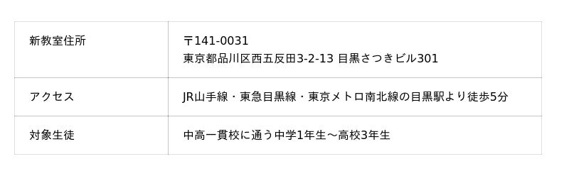 目黒エリアは、多くの中高一貫校生が通学および居住する地域です。中高一貫校特有の速い授業進度や独自の難易度に合わせた専門指導の需要は年々増加しており、旧・目黒教室では在籍生徒数が100名を突破しました。より多くのお子さまに、ゆとりある「第二の勉強部屋」を提供するため、同エリア内での拡大移転を実施いたしました。