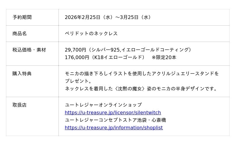株式会社ユートレジャー(本社:東京都新宿区、代表取締役社長:青木 興一、株式会社ケイ・ウノの連結子会社)は、人気ハイファンタジー作品『サイレント・ウィッチ 沈黙の魔女の隠しごと』とコラボレーションしたネックレスの予約受付を2026年2月25日(水)~3月25日(水)の期間限定、ユートレジャーオンラインショップ、ユートレジャーコンセプトストア池袋・心斎橋にて行います。ユートレジャーでは初めての取り扱いライセンスとなります。