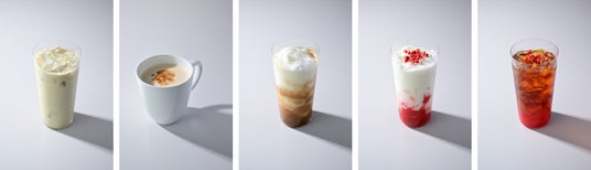 ▲左から、ソルベージュ(R)エスプレッソ、ソルベージュ(R)ストロベリーミルク、ジャスミンティーラテ、アールグレイ&ストロベリーティー、チャイティーラテ」