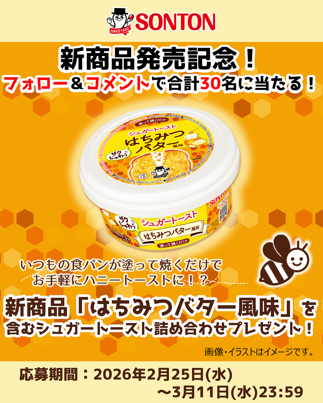 ソントン食品株式会社(本社:東京都江東区、社長:石川紳一郎、以下ソントン)は、2026年3月3日(火)に、食パンに塗ってから焼くタイプのトースト用クリーム「シュガートースト はちみつバター風味」を新発売いたします。本商品は、シュガートーストユーザーが食べたい味わい1位に輝いた待望の新商品であり、はちみつパウダーと発酵バターパウダーを配合し、本格的な味わい・香りにこだわって開発されました。