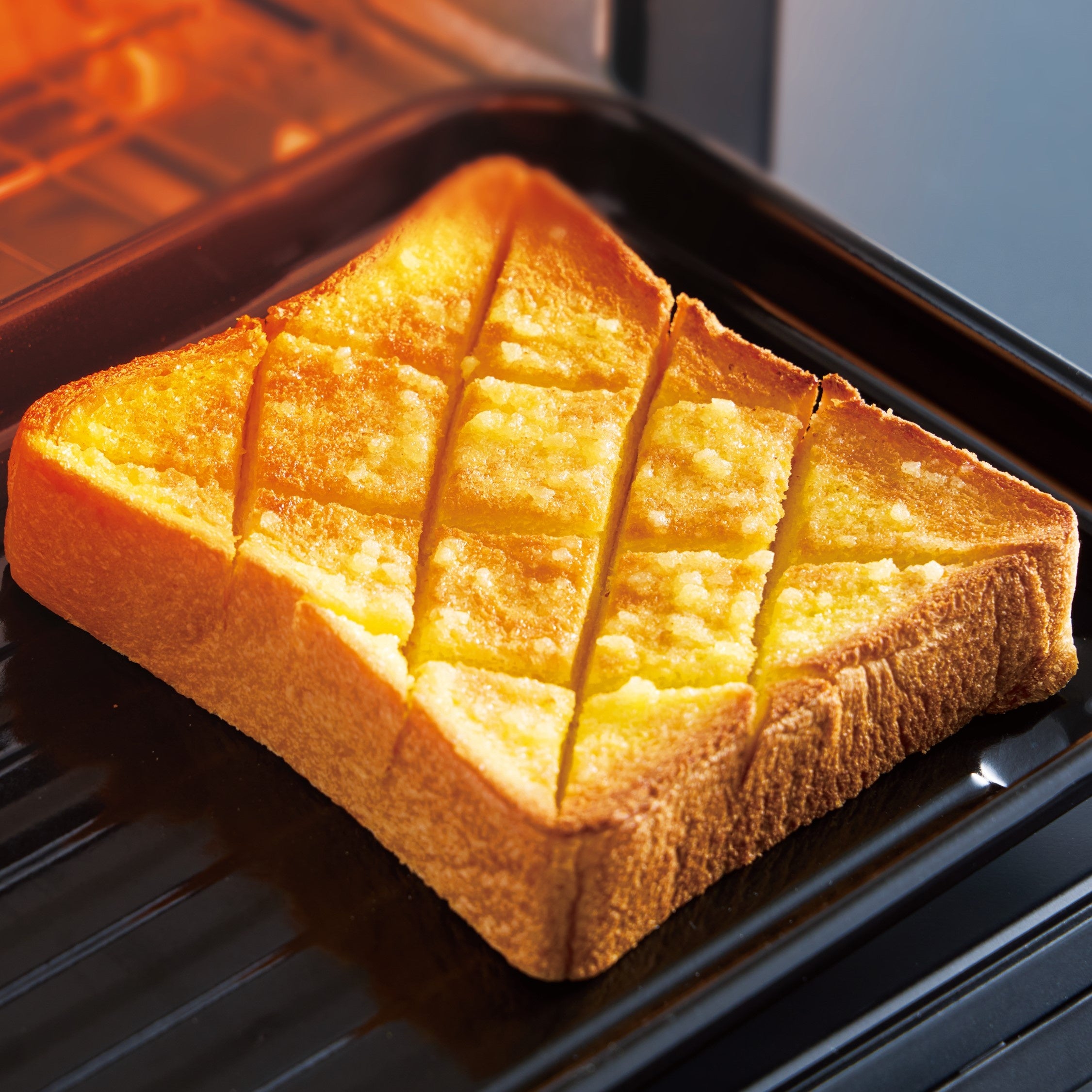 クリームを塗った食パンにトースターで熱を加えることで、クリームが溶けてトーストに染み込み、表面がこんがりと焼き上がります。