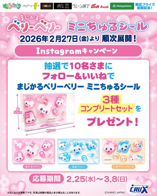限定プライズ用景品の展開を記念し、モーリーファンタジー公式X・Instagramでは、「まじかるベリーベリーミニちゅるシールコンプリートセット」が抽選で各10名さまに当たるSNSキャンペーンを開催いたします。詳細は公式アカウントをご確認ください。