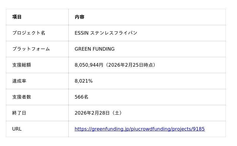 キッチンウェアブランド「ESSIN(エッシン)」がGREEN FUNDINGにて展開中のステンレスフライパンプロジェクトは、支援総額800万円・達成率8,000%・支援者566名を突破しました(2026年2月25日時点)。 また、ミシュランガイド掲載フレンチレストラン「ラチュレ」オーナーシェフ・室田拓人氏が実際に厨房で使用し、プロの現場視点で評価をいただくなど、家庭用途に留まらず、料理の第一線からも支持を集めています。