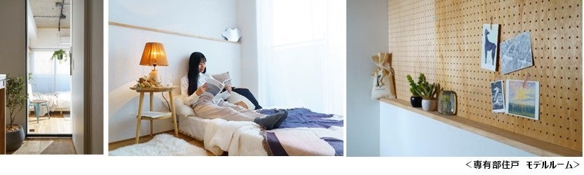 専有部住戸は、16.66平方メートル ~37.36平方メートル の全17タイプとし、躯体現しの天井やカウンターキッチン、シャワーブースを備えたタイプなど、多彩なバリエーションを設けています。天然木の無垢床フローリングやラワン素材の有孔ボード、見せる収納等を採用し、快適性・効率性を追求しながらも、どこか温もりを感じさせる「自然体で自分らしさ溢れる住空間」を提供します。