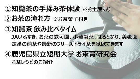 今回は南九州市の協力のもと、日本茶アドバイザーの方に昔ながらのお茶の製法や美味しい淹れ方を教えていただきます。また、各企業から提供いただいた知覧茶の飲み比べも楽しめます。
