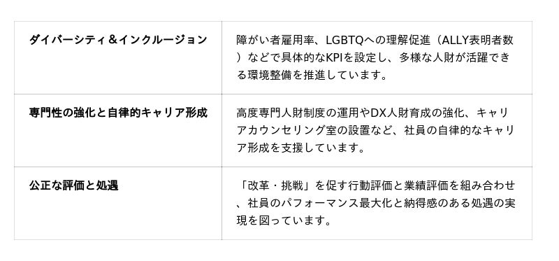 このたびの受賞では、経営層のリードによる推進体制の整備や、経営戦略と人材戦略を連動させた適切な指標設定や情報開示について高く評価されました。