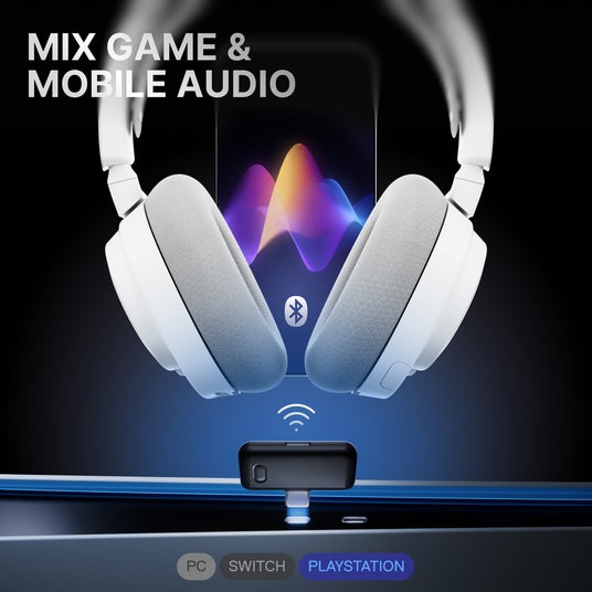 付属のUSB-Cドングル経由の2.4GHz超低遅延ワイヤレスと、Bluetoothを同時接続と同時再生が可能です。例えばゲーム音とモバイル通話を一緒に聴くことができます。