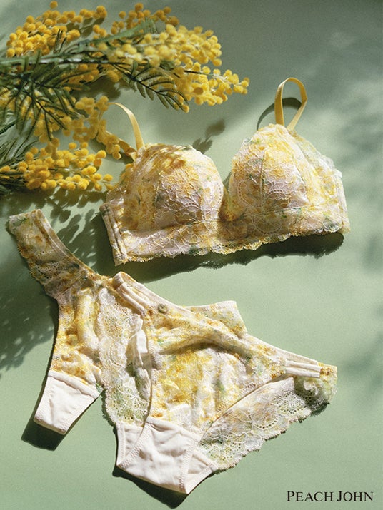 透け感のある編み柄と光沢感のあるサテン調素材のコントラストが印象的な、ストレッチラッセルレースを贅沢に使用した「ナイスバディブラ」シリーズ。新色“ミモザ”はホワイトをベースに、イエローの濃淡とグリーンで水彩画調の花柄をプリント。“サクラ“はライトピンクをベースに、中心を濃いピンクの桜の花をプリントしました。