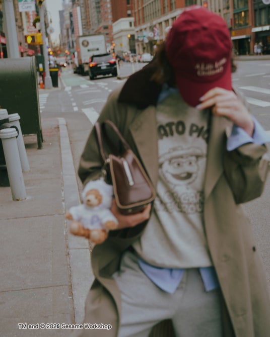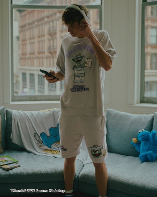 アーチロゴの下にエルモ、クッキーモンスター、オスカーをシンプルな線画であしらったポップなデザイン。インでもアウトでもバランスの取りやすい丈感で心地よくお過ごしいただけます。