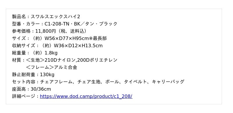 ビーズ株式会社(本社:大阪府東大阪市、代表取締役社長:大上響)が展開するアウトドアブランド「DOD」は、従来モデル比で約65%のコンパクト化を実現した折りたたみ式ハイバックチェア「スワルスエックスハイ2」を2026年2月24日より発売します。