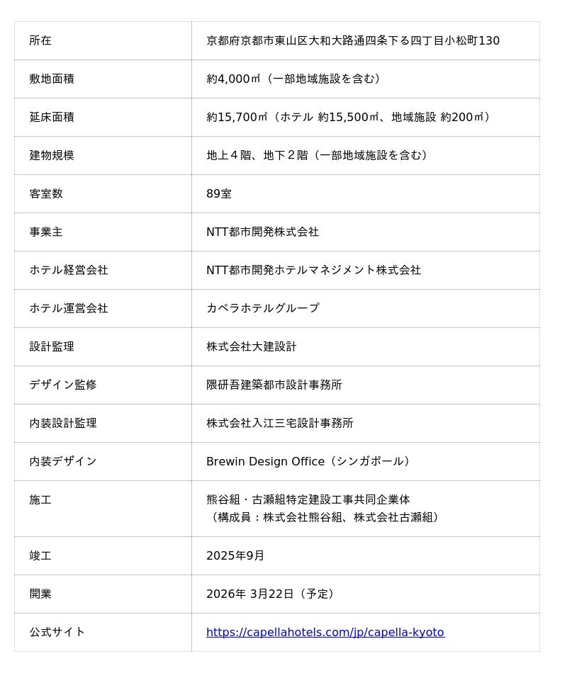NTT都市開発株式会社(本社:東京都千代田区、代表取締役社長 池田 康、以下「NTT都市開発」)が開発・所有し、グル ープ企業でホテル経営会社である NTT都市開発ホテルマネジメント株式会社(本社︓東京都千代田区、代表取締役社長 松本 順一、以下「NTT都市開発ホテルマネジメント」)が経営する「カペラ京都」(京都市東山区、運営:カペラホテルグループ、総支配人 ジョン・ブランコ)は、2026年3月22日(日)に開業することを決定いたしました。