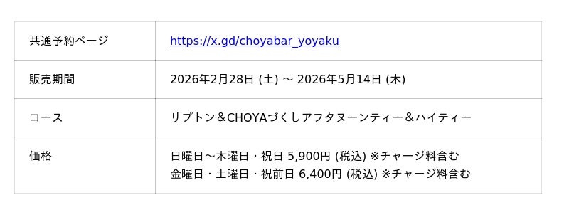 チョーヤ梅酒株式会社 (本社:大阪府羽曳野市、社長:金銅重弘、以下チョーヤ) は、梅酒カクテル専門店「The CHOYA 銀座BAR (ザ チョーヤ ギンザバー) 」にて、リプトン イエローラベル製品と完熟南高梅を使用したコラボレーションメニュー「リプトン ロイヤルミルク梅プリン」「リプトン 桜ミルクティー梅プリン」の2種類を2026年2月28日 (土) から5月14日 (木) まで期間限定で販売します。