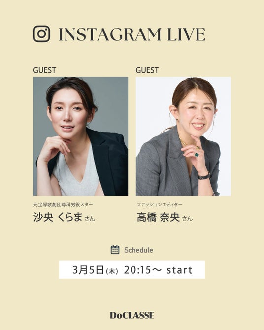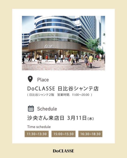 婦人服・紳士服の製造販売ブランド、株式会社 DoCLASSE(ドゥクラッセ)は2026年3月11日(水)に宝塚の聖地「日比谷シャンテ」内の店舗にて、元宝塚劇団専科男役スターの沙央くらまさんを招いた1日店長イベントを開催いたします。
