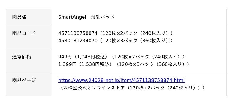 株式会社西松屋チェーン(兵庫県姫路市、代表取締役社長:大村浩一)は、ママ・パパと赤ちゃんの快適な毎日を応援するプライベートブランド「SmartAngel(スマートエンジェル)」から、高品質・低価格を両立した「SmartAngel母乳パッド」に、お求めやすい大容量の120枚×3パック(360枚入り)を新発売いたしました。従来の120枚×2パック(240枚入り)とともに、全国の当社店舗にて発売しております。