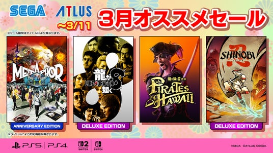 株式会社セガは、PlayStation(TM)Storeおよびニンテンドーeショップにて販売中の一部PlayStation(R)5/PlayStation(R)4/Nintendo Switch(TM)/Nintendo Switch(TM) 2用タイトルを対象とし、期間限定で特別価格にて販売する「セガ 3月オススメセール」を開催中です。