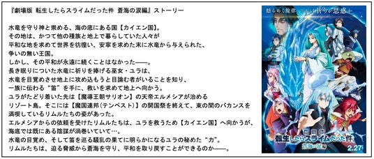 『転生したらスライムだった件』は、異世界で一匹のスライムに転生した主人公が、身につけたスキルを駆使し、知恵と度胸で仲間を増やしていく異世界転生エンターテインメント。TVアニメ『転生したらスライムだった件』第1期は2018年10月より2019年3月までTOKYO MXほかでTV放送された。更に2021年には、1月から3月までTVアニメ第2期の第1部、4月から6月までスピンオフコミックのアニメ化作品『転生したらスライムだった件 転スラ日記』、7月から9月までTVアニメ第2期第2部と、9ヶ月連続でTV放送。そして2022年11月25日に『劇場版 転生したらスライムだった件 紅蓮の絆編』が全国公開され、国内動員数100万人超、興収14億円を記録する大ヒット。WEB小説『転生したらスライムだった件』の連載開始10周年を記念して、2023年2月20日に「転スラ10thプロジェクト」が始動。プロジェクトの一環として、 2023年11月1日に、完全新作アニメーション『転生したらスライムだった件 コリウスの夢』全3話の配信がスタート。そして、2023年12月16日には、シリーズ初の大型イベント「転生したらスライムだった件 転スラ 10thライブ」が松戸・森のホール21にて開催。さらに、2024年4月から同年9月にはTVアニメ第3期放送。第3期最終話放送後、劇場版第2弾&TVアニメ第4期の制作が決定。そして『劇場版 転生したらスライムだった件 蒼海の涙編』の公開が2026年2月27日(金)に決定。